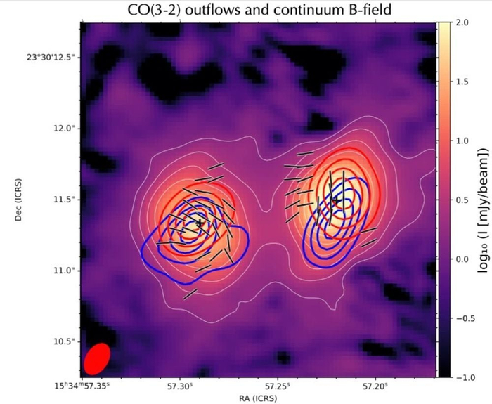 该研究的另一幅图。这幅图显示了快速分子红移外流(红色轮廓)和蓝移外流(蓝色轮廓),它们叠加在总强度和磁场方向上。图片来源:LopezRodriguez等人,2026年,《天体物理学杂志通讯》