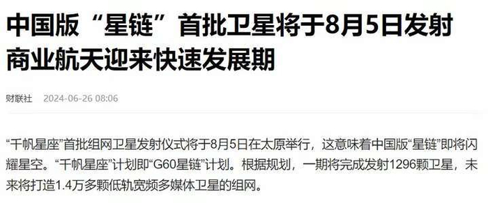 财联社7月24日报道《中国版“星链”首批卫星即将发射 机构建议提前布局重要环节公司》