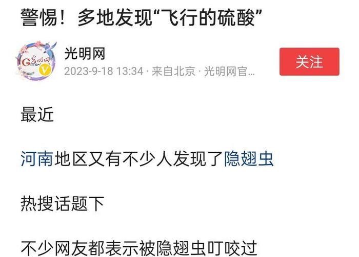今年有一种小虫子颇受关注,就是隐翅虫!今年终于两次上了热搜,上一次是7月份,如今再次上榜。光明网9月18日发文报道称《警惕!多地发现“飞行的硫酸”》,表示河南多地不少人发现了这种小虫子。