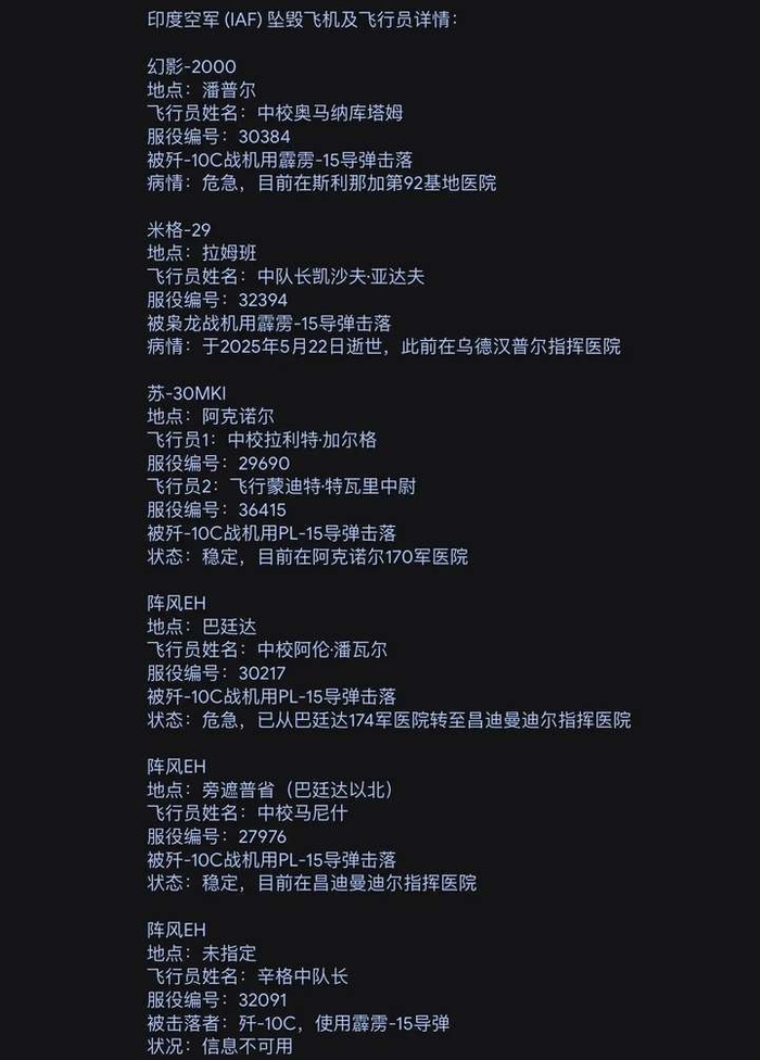 其公布的信息具体到每一架战机及飞行员的情况,包括战斗机的型号,飞行员的服役编号,伤情和所在的医院,以及设备歼10还是枭龙击落的,但所使用的导弹均是霹雳15E,重要信息可谓一应俱全。