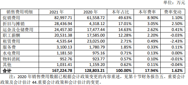 转型也体现在大幅增长的促销费用上。2021年其促销费用约为8.3亿元,占到销售费用的一半左右,同比增长34%。