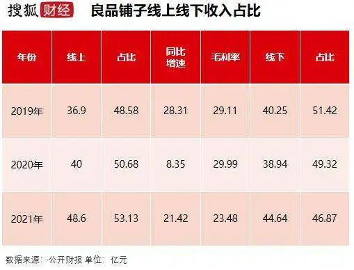 搜狐财经盘点发现,2019年时,良品铺子线上收入为36.9亿元,占比48.58%,略低于线下51.42%的占比;2020年时线上线下基本持平,线上收入达40亿元,占比50.68%。