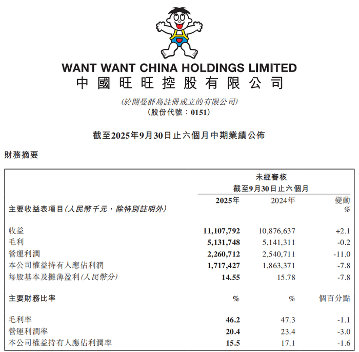 11月24日晚间,中国旺旺披露2025财年上半年财报(2025年4月1日至9月30日)。报告期内,公司实现营收111.08亿元,同比微增2.1%;但股东应占溢利17.17亿元,同比下滑7.8%,陷入“增收不增利”困境。净利率降至15.46%,创近四年同期最低,业绩表现低于市场预期。