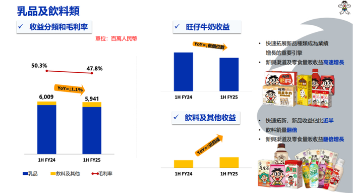 作为公司营收“半壁江山”的乳品及饮料业务(核心产品为旺仔牛奶),上半年实现营收59.41亿元,同比下滑1.1%,拖累整体板块表现。该板块毛利率从 50.3%下滑至47.8%,利润承压显著。
