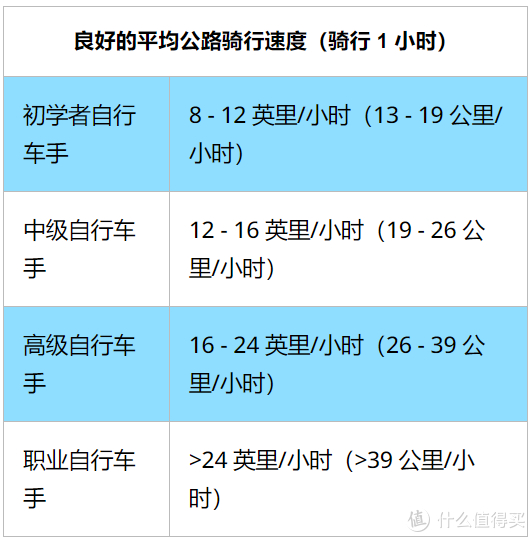 下表列出了不同经验水平的骑行者在道路上骑行的良好平均速度。