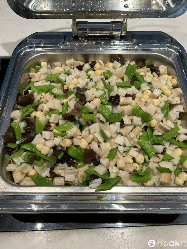 7个热菜:玉米鸡丁、炒豆角、辣椒炒鸭肉块、扁豆藕丁、黄瓜肉片、莴笋木耳、排骨冬瓜汤
