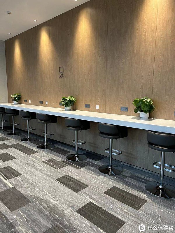 (二)工作区的座位是高脚酒吧椅,有电源插座、USB手机充电口,适合办公需求,位于靠近安检通道那个门附近。