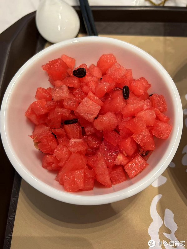 ⑧水果有2种,哈密瓜、西瓜都是切成水果丁,放在一个塑料盒子里,用勺子取餐。