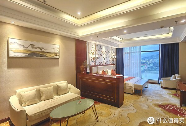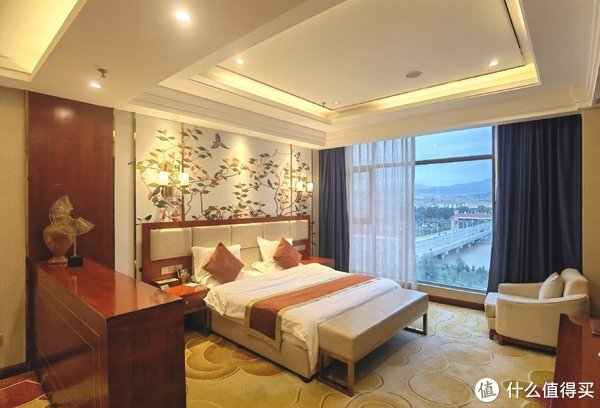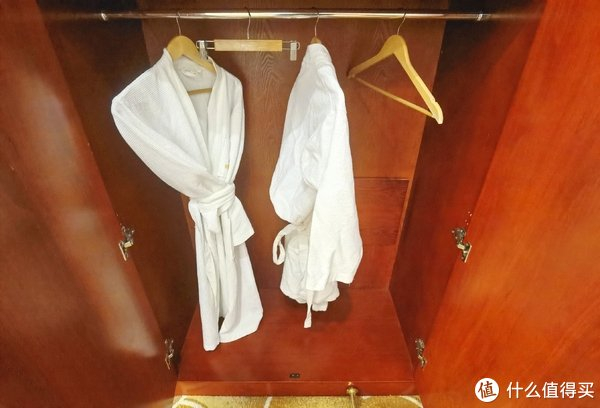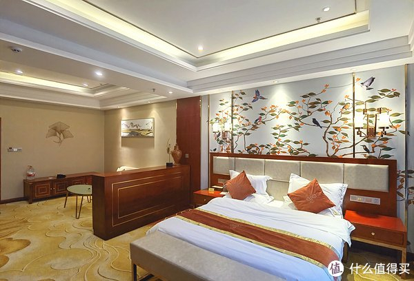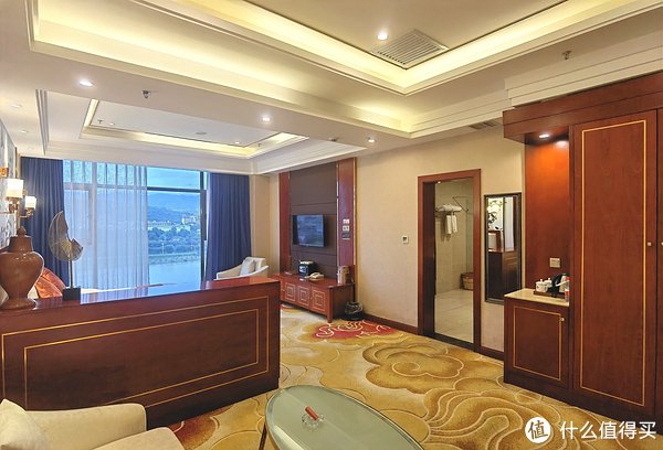 行政房确实很宽敞,放行李的位置也很宽裕,进门会客区,和床之间有个半隔断,免费水农夫山泉,衣柜里有配浴袍,大床配有床尾凳,背景墙还是挺漂亮的。