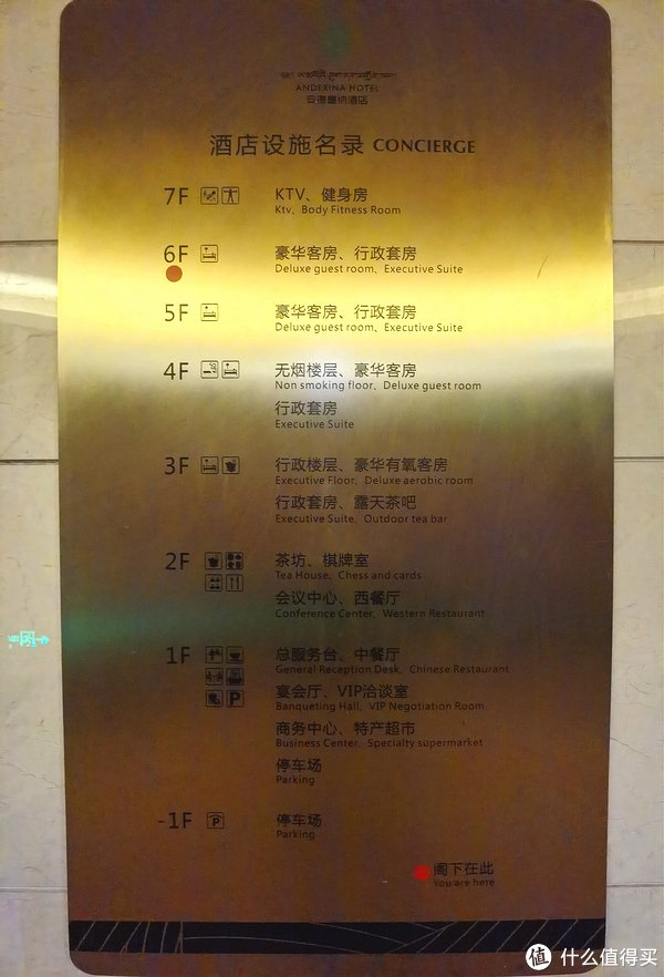 酒店大堂双层挑空,有很多藏式装饰,客房总共7层,从电梯间标牌来看,各种设施也是很齐全的。