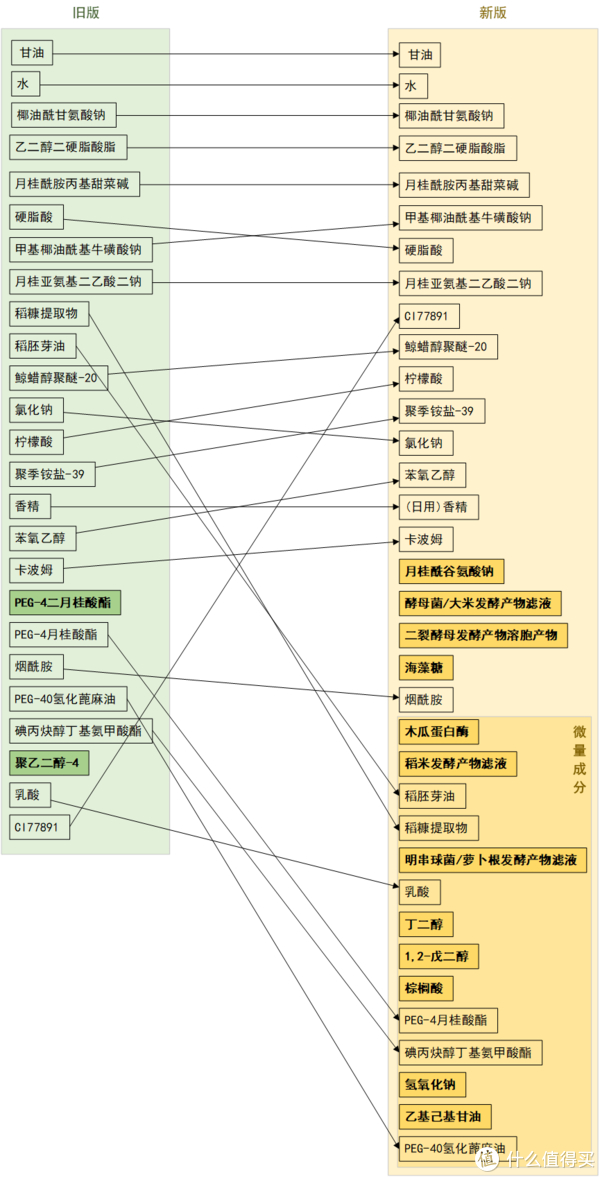 从图表中很清楚能看出来,旧版的旁氏米粹的成分,只有2种成分不在新版中,分别是PEG-4二月桂酸酯,聚乙二醇-4。新版的旁氏米粹成分,新增加了12种成分,其中有4种被标记为不是微量成分,另外8种新增成分标记为微量成分。