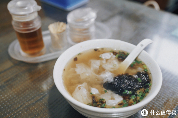 馄饨皮极薄,漂在汤里,像金鱼一样的尾巴一样轻盈好看。