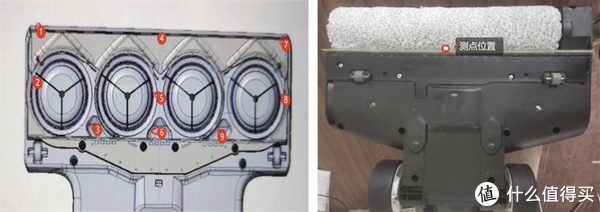 科学院力学研究所的测试点位选取米博V6A刷头接地面的9个位置(核心吸口位是点5、点6),传统滚刷洗地机测试点选取在的吸口中心的接地点处,如下图所示。