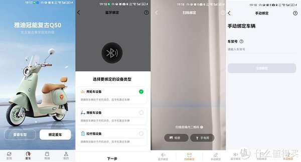 ▲下载雅迪智行APP,可以使用蓝牙、扫码、手动输入车架号三种方式绑定车辆。