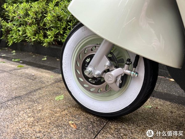 ▲黑白拼色的小白轮搭配绿色轮毂,比我以往看到的电动车都要精致特别。