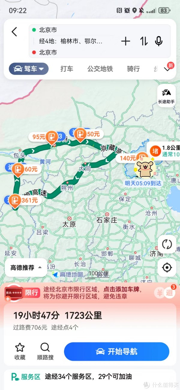 1)综合考虑五一假期时间较充裕、节前火车票难抢、机票加价严重、高速不收费等因素,选定自驾出行方式,以错峰出行、舒适体验为目标,参考HUMANPLANET的50条国内自驾线路和内蒙古分册,选定北京-榆林-鄂尔多斯-包头-呼和浩特-乌兰察布-北京这一自驾环线,全程约1800公里,驾驶时长约20小时。