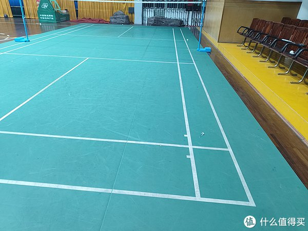 给大家看看羽毛球场地的图片,对比一下,确实场地大小差不多,但是,不一样的是羽毛球中间的网是比较高的,正式比赛时,球网中部上沿离地面必须为1.524米高,球网两端高为1.55米。球网的两端必须与网柱系紧,它们之间不应该有缺缝。而且,看地上的白线,羽毛球场地是有划分单打区域和双打区域的,同样的,网球场地也有划分单双打的区域线。