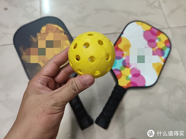 先来说说匹克球,这个是匹克球的球体,按照国际匹克球联合会的规定:匹克球的直径为74mm左右,塑料制作的空心球,匹克球为白、黄、绿等较为醒目的亮色,表面布有26个(室内)或40个(室外)圆孔,我这个就是黄色的室外场用球。