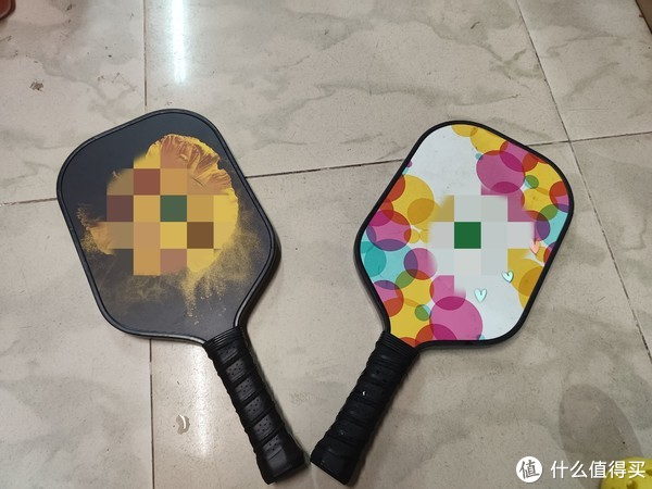 接着就是匹克球球拍,可以说就是大号的乒乓球拍了,继续国际匹克球联合会规定:匹克球拍的大小是长398mm、宽194mm,重量在200到250克之间,相当于半瓶矿泉水的重量,据说最初的匹克球拍还真是和乒乓球拍一样是木质的,后来经过革新,慢慢被运动表现更好的玻璃纤维、碳纤维等新型材料代替。这一对匹克球拍就是碳纤维的,手感比较轻,但是却很坚硬,不易坏。