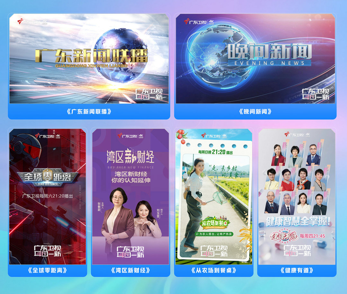 “6”档常规节目:《广东新闻联播》《晚间新闻》两大新闻栏目年内全新改版升级,聚焦湾区火热建设,打造“评论天团”,全面提高舆论引导力。《全球零距离》《湾区新财经》《从农场到餐桌》《健康有道》品牌栏目完成4K改造,大小屏联动,打造全国垂类强势IP。