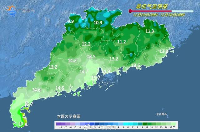 12月28日,粤西偏西多云,其余大部分市县晴到多云。最低气温:粤北、珠三角北部市县7~10℃,局部5~7℃,南部沿海市县12~15℃,雷州半岛15~17℃,其余我省大部分市县10~12℃。