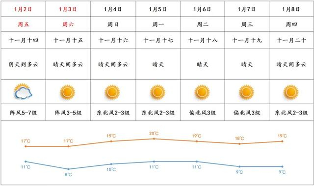 1月2日,全省大部多云到阴天转晴到多云。最低气温:粤北、珠三角北部市县4~8℃,其中高海拔山区-1~2℃,局部有冰冻或霜冻,粤西沿海市县12~15℃,其余市县9~11℃。