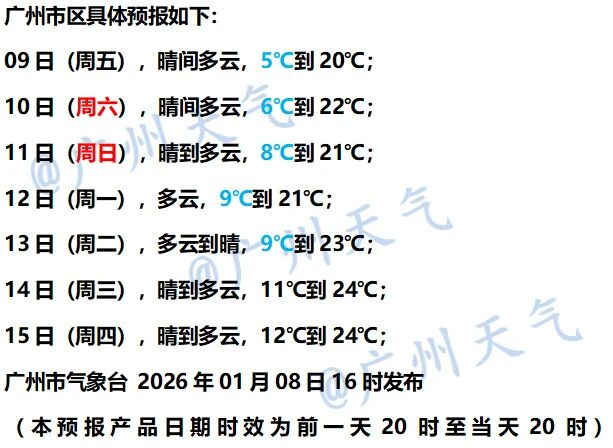 最低气温:粤北、珠三角北部市县5~8℃,雷州半岛市县12~14℃,其余市县9~11℃。