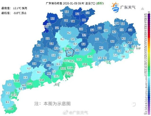 预计,9日受冷高压控制,广东大部维持晴朗干燥天气,昼夜温差大,早晚寒冷,粤北和珠三角北部有大范围5℃以下低温,部分市县有霜冻或冰冻;10日云量有所增加,气温回升,粤北市县仍有5℃以下低温;11日受弱冷空南下影响,白天最高气温小幅下降。