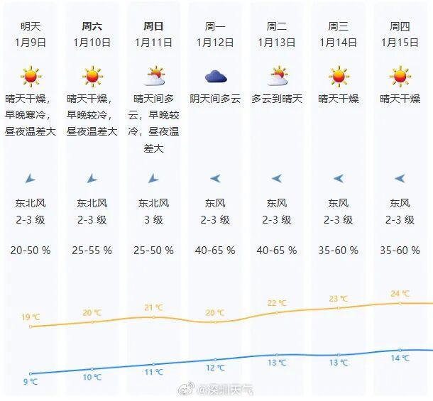 深圳天气方面,未来几天晴燥持续,气温缓慢回升,早晚体感依然“冻人”。预计9日持续晴天干燥,昼夜温差大,气温9-19℃;10-11日晴天干燥持续,气温逐日缓慢回升;12日湿度加大,云量增多;13-15日转晴天干燥,早晚清凉,白天温暖。