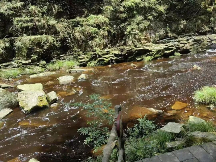 其实,景区内这种茶色的溪水叫做“茶溪”,是溪水常年渗泡落叶而变色。