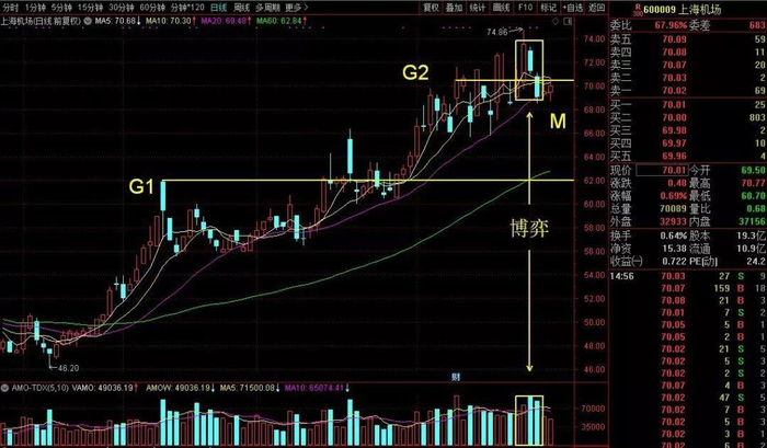 上海机场的走势上有两个G点线,G1是2019年2月25日放量假阴线上沿形成的,G2是2019年4月29日放量长阳上沿形成的。