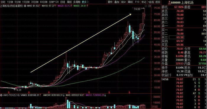 前几天分析的都是一路走低的伪“白马”!今天看到上海机场的走势才能真正体会到一路上行带来的白马气息。