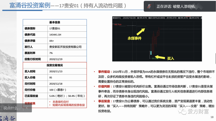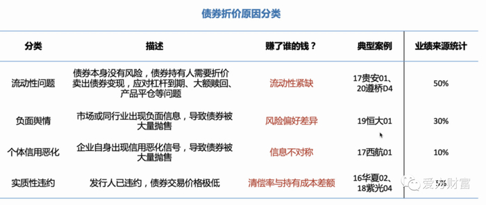 漆总认为,动性问题是债券折价的主要原因,公司产品的业绩60-70%来源于此。个体信用恶化的债券如果能够识别出有信用修复预期的信号,就可以博一把。实质性违约如果清偿率足够高,持有成本足够低那么也可以交易。第三类第四类交易活跃程度非常高,换手率很高,要高于负面舆情导致的折价(第二类)。
