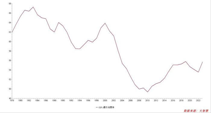 居民可支配收入占GDP比重持续提升,消费在国民经济中地位增强。2003-2012年:居民收入占比持续下降,占比从62%2003)下降到43%2012),年均下降约2个百分点。同期GDP年均增速超10%,但收入增长滞后。 2013-2023年:居民收入占比缓慢回升,占比从43%回升至约 45%~48%2023),仍显著低于2000年代初水平。2019年后受疫情冲击短暂下滑,2023年逐步恢复。