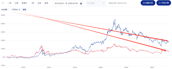 •       2024年中证消费指数下跌7%,沪深300上涨15%2025年至今消费微跌0.1%,沪深3003%