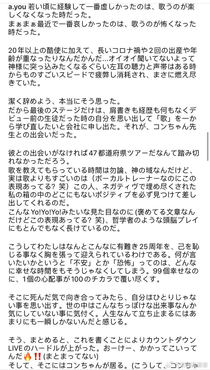 滨崎步表示,在演艺生涯20多年的历练中,她已成为一位双胞胎妈妈,经历过疫情冲击的洗礼。而随着年岁的增长,她不仅发现左耳听力和声带受到了巨大损耗,出现了明显的问题,身心亦感疲惫不堪。这一系列因素让她开始认真思考是否应该告别演艺圈,希望能够“优雅地退休”。