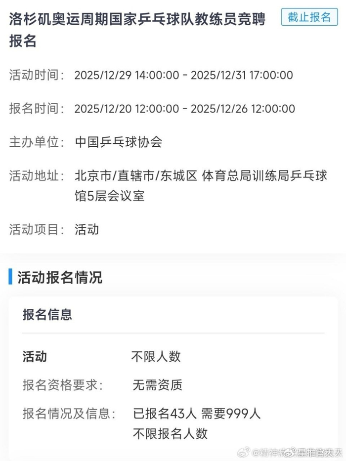 北京时间12月29日,洛杉矶奥运周期国家乒乓球队教练员竞聘正式开始,报名人数最终确定为43人,将录取包括总教练在内的28人。