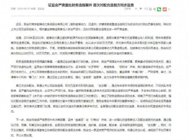 6月27日晚间,越博动力披露公司及相关责任人近日收到中国证券监督管理委员会(下称“证监会”)下发的《行政处罚事先告知书》,证监会查实,越博动力存在连续五年财务造假、未按规定披露关联交易及重大诉讼等违规情况。证监会拟对越博动力及相关责任人员给予警告,并开出总计3310万处罚单。