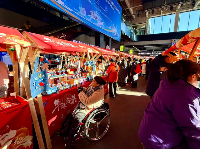 颇具辽宁特色的“助残暖冬·辽宁非遗文创市集”,吸引不少公众驻足在滑雪场外,颇具辽宁特色的“助残暖冬·辽宁非遗文创市集”人气爆棚。文创展示区的剪纸、满族刺绣、皮影、布贴画等残疾人文创精品琳琅满目,尽显辽宁文化底蕴;手工互动区,非遗传承人指导残疾人朋友制作冰雪主题面人、年味糖人、吉祥对联,传承民俗文化;美食品尝区内,沈阳鸡架、沟帮子熏鸡、海城馅饼等辽宁特色美食香气四溢,让参与者在赏冰乐雪之余,品味舌尖上的辽宁风情。