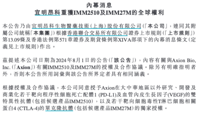 2024年8月,宜明昂科授权给AxionBio的两款核心资产——IMM2510和IMM27M,分别针对PD-L1/VEGF双靶点和CTLA-4靶点,这本应是公司海外商业化的希望。