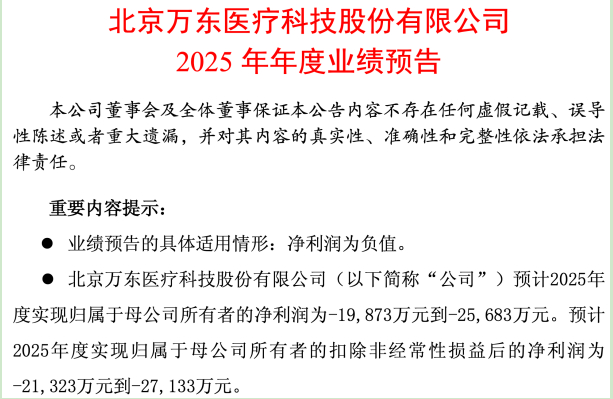 就在1月30日股市收盘后,万东医疗火速发布了2025年度业绩预告。数据显示,公司预计全年归母净利润将亏损1.99亿元至2.57亿元,扣非后净利润亏损更是高达2.13亿元至2.71亿元,而2024年盈利1.57亿元。这一亏损幅度,不仅将前三季度2720.98万元的净亏损大幅放大,也创下了公司上市以来年度业绩的最差纪录。有意思的是,据全年预亏数据倒推,仅第四季度单季亏损额就高达1.72亿元至2.30亿元,亏损呈现加速扩大态势。