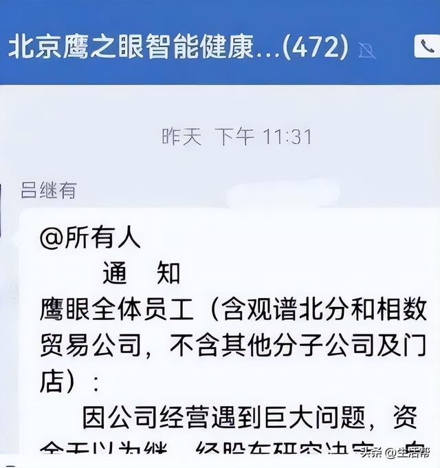 类似的还有医疗行业AI医疗企业鹰眼智慧中医突然宣布解散。网传截图显示,鹰眼智慧中医战略管理部总经理兼总裁办公室主任吕继有,在企业微信全员群里发布了解散通知,全体员工解聘。