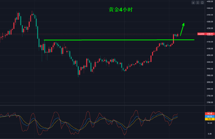 继续说一下黄金,此次上涨突破4050美元之后,多头强势延续不断刷新高,今天已经站在4200美元的,距离新高的位置越来越近。