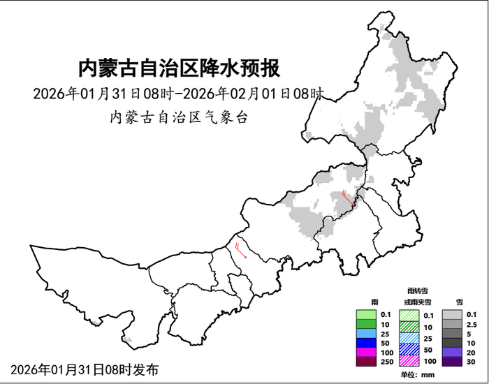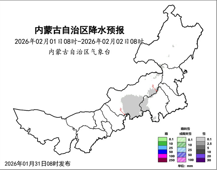 具体未来三天天气预报如下:1月31日08时至2月1日08时,阿拉善盟南部偏南、锡林郭勒盟东部、赤峰市西北部、通辽市西北部、兴安盟西部、呼伦贝尔市南部和东部部分地区多云,有分散性小雪;中部偏西和偏南、东南部偏西地区有4、5级局地6级西北风。