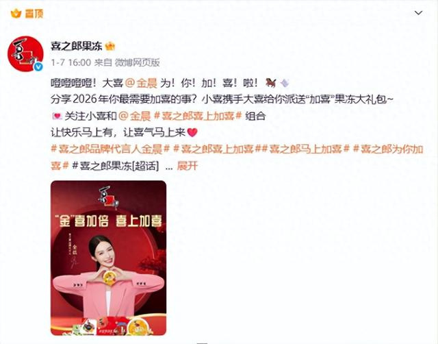 此前于1月7日,该账号曾置顶发布金晨代言宣传,并配文“喜之郎喜上加喜组合”并艾特金晨微博。
