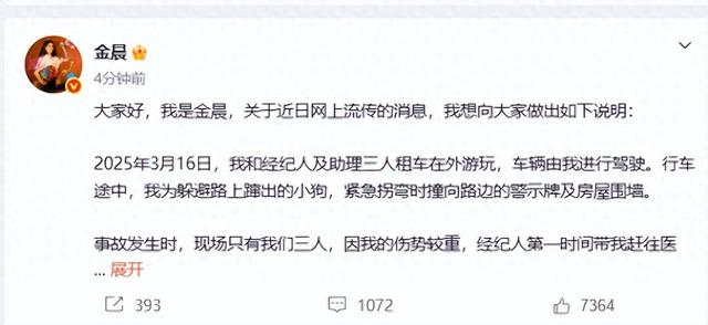 刚刚,金晨发布最新微博: