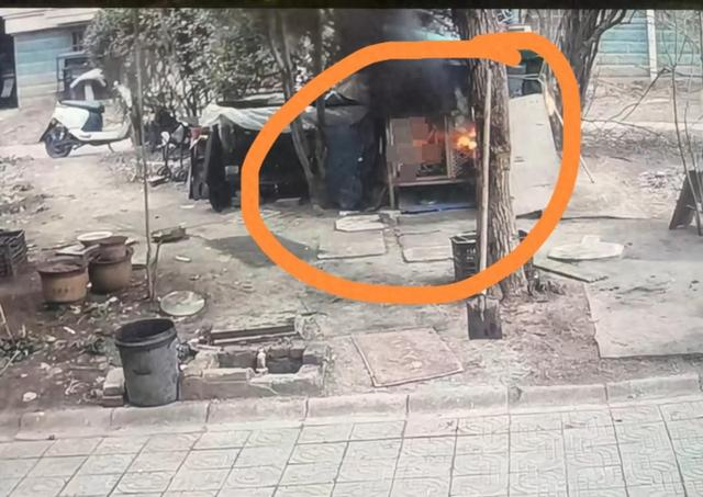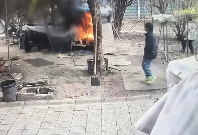 12时35分40秒左右,两个小男孩再次来到狗笼外,共同点燃一支烟花,这时狗笼内的烟稍大,他们观望后没有再将烟花扔进笼内。随后,黑衣小男孩拿着烟花去追一只鸡,白衣小男孩在狗笼外观察后大叫“着火了”。12时37分,狗笼内有浓烈的黑烟升起,不久烈火将笼子吞噬。