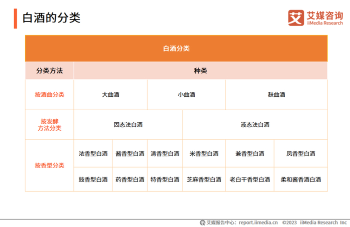 白酒是以高粱等谷物为主要原料,以大曲、小曲或麸曲及酒母等为糖化发酵剂,经蒸煮、糖化、发酵、蒸馏、陈酿和勾兑而酿制而成的各类酒。白酒主要有四种分类方式:按原料分类、按使用酒曲分类、按发酵方法分类、按香型分类。其中以香型分类的方法最为常用,可分为浓香型、酱香型、清香型、米香型等12种香型白酒。浓香型、酱香型和清香型是目前市面上最主要的白酒香型,被称为中国的三大香型白酒。