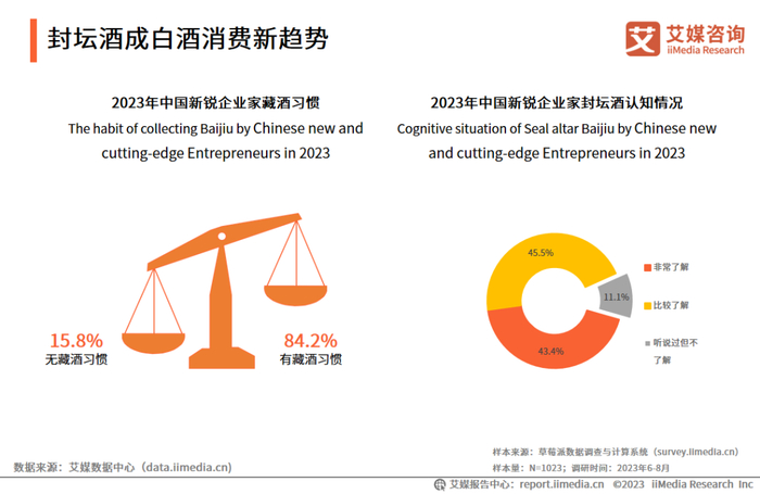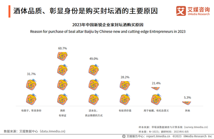 iiMedia Research(艾媒咨询)调研数据显示,超八成的新锐企业家平时有藏酒的习惯,其购买封坛酒的原因是酒质有保证(60.7%)、喜欢封坛的仪式感(59.5%)等。封坛白酒作为高端酒品,其原料及制作工艺要求十分严格,酒体质量有一定的保障。封坛时的仪式感和带来的诸多话题让消费者倍感尊重,彰显了封坛酒的产品价值。
