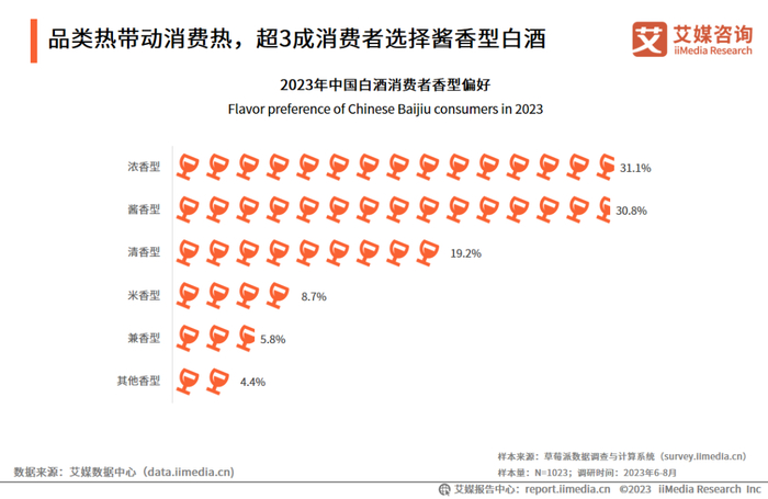 iiMedia Research(艾媒咨询)调研数据显示,在白酒香型偏好上,选择酱香型白酒的消费者达30.8%,接近选择浓香型白酒的消费者(31.1%)。艾媒咨询分析师认为,以茅台为首的酱香型白酒企业掀起了酱酒市场消费热潮,消费观念升级以及酱酒独特的醇厚口感,使得酱香型白酒成为近几年的白酒品类大热门。酱酒相对较高的产品定位及高品质特点,符合当下主流消费群体的需求,驱动消费群体进一步扩大。